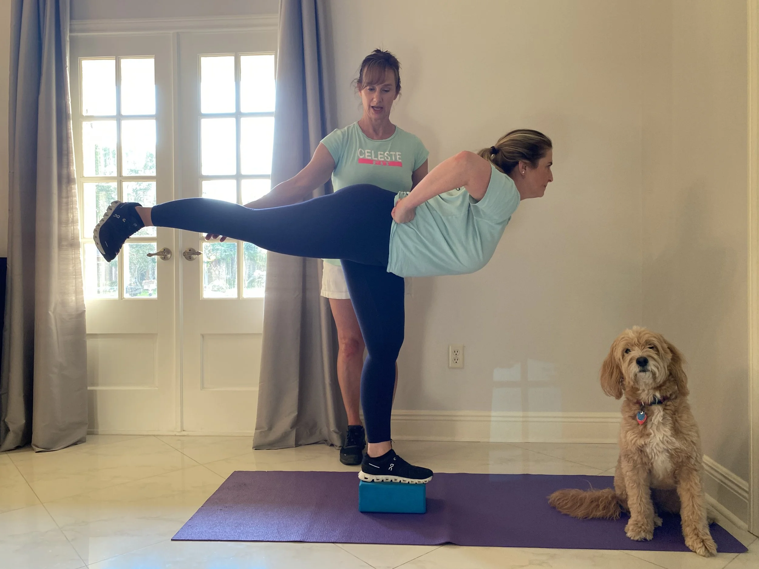 2. Single-leg Romanian deadlift: Place your left foot on yoga block as you lean forward with a flat back and straight leg left behind you. Your left foot is flexed and hips are squared to the ground. Slowly return the left leg to starting ;position and keep your hands by your ears. Complete 10 reps on each leg.